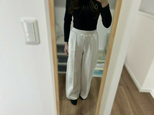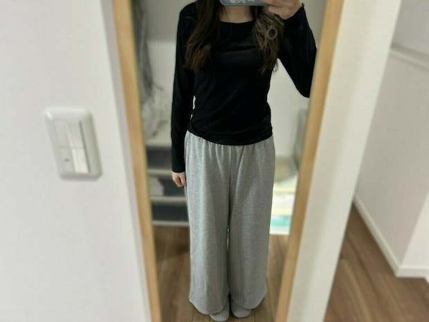 続いてご紹介するのは、ウエストのギャザーとワイドシルエットがおしゃれな「スウェットワイドパンツ」です。