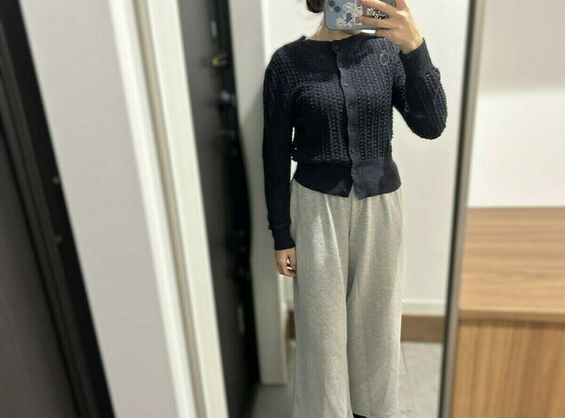 デザインは非常にシンプルで、袖口や裾にリブ編みがなく、パンツやスカートにインしてもスッキリ着こなせます。