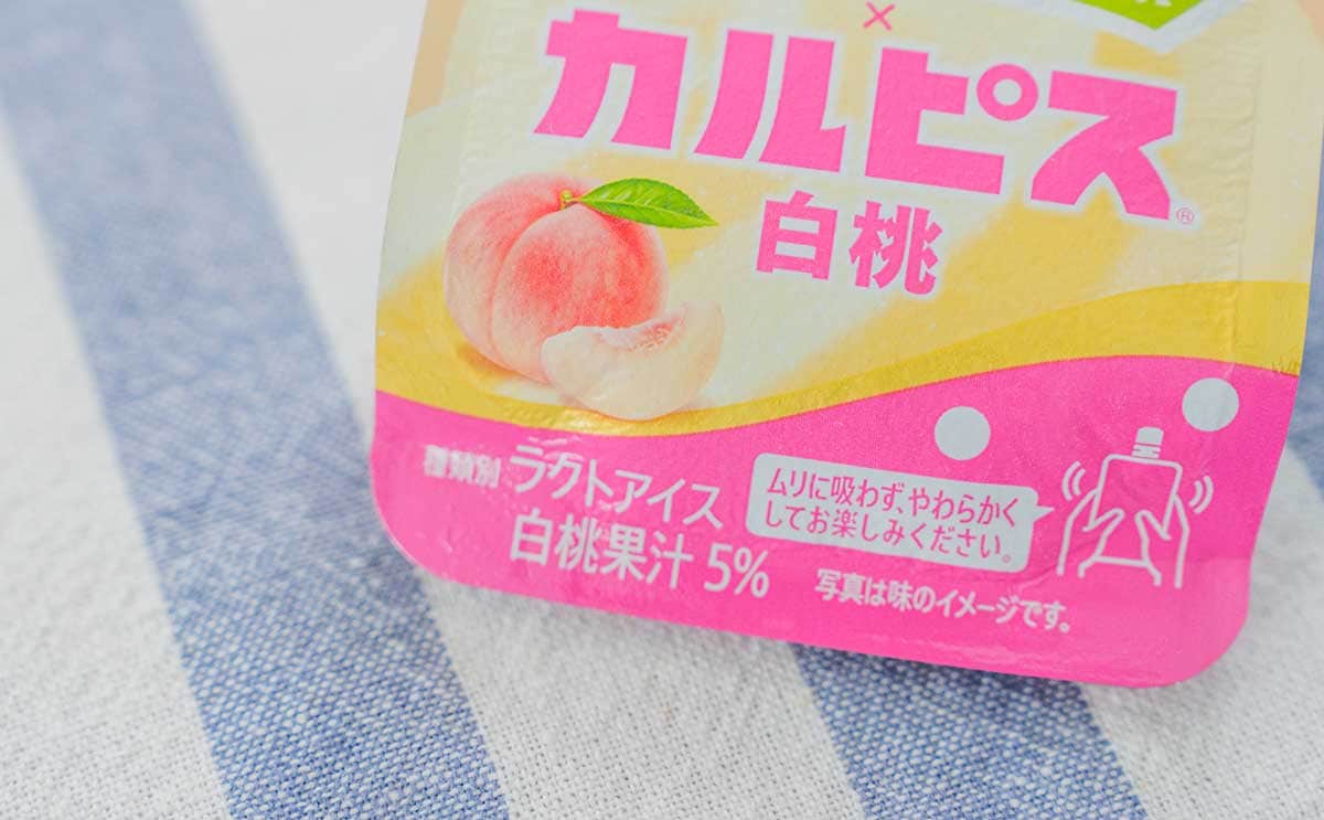 1個(135ml)当たりのエネルギーは125kcal、たんぱく質1.2g、脂質3.7g、炭水化物21.8g、食塩相当量0.047g。種類別は「ラクトアイス」で、白桃果汁5%です。
