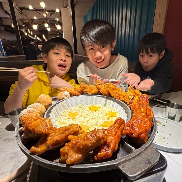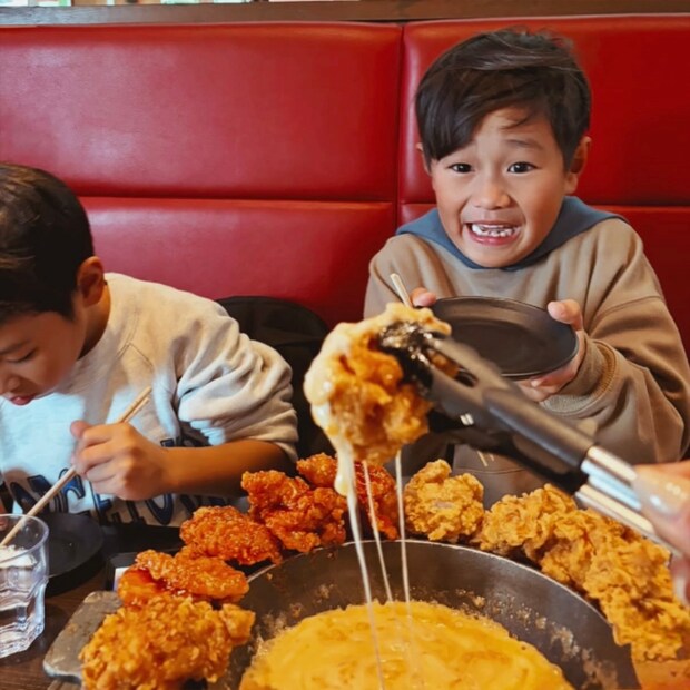 新大久保で子供達が楽しみにしていたのが、UFOチキン!トロトロのチーズにチキンをつけながら食べるのが最高です。この日はプングム新大久保本店へ!ここは広くてとても綺麗。子供用の食器も揃っているし、UFOチキンは星型のチーズが入っていたり、メニューひとつにしても子供達が喜ぶポイントが多いです♪