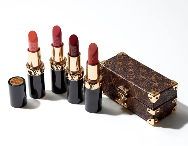 LV ルージュ 左から:600 オン ザ エッジ、201 スペル オン ユー、896 モノグラム・ルージュ、105 ヌード ネセセール 各¥23,100、トランク リップスティックケース¥443,300(全てルイ・ヴィトン クライアントサービス)