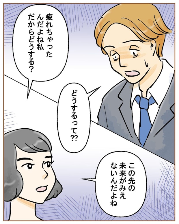 「疲れちゃったんだよね私。だからどうする?」と言うと、「どうするって??」と意味不明なツカサに、「この先の未来が見えないんだよね」と切り出しました。