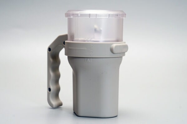 直径約8cm、長さ約8cmの円筒形の本体に取っ手の付いた、いかにも懐中電灯然としたスタイルで、電池ボックスを開けると単1形~単4形までの乾電池をそれぞれ収納できるスペースが確保されています。