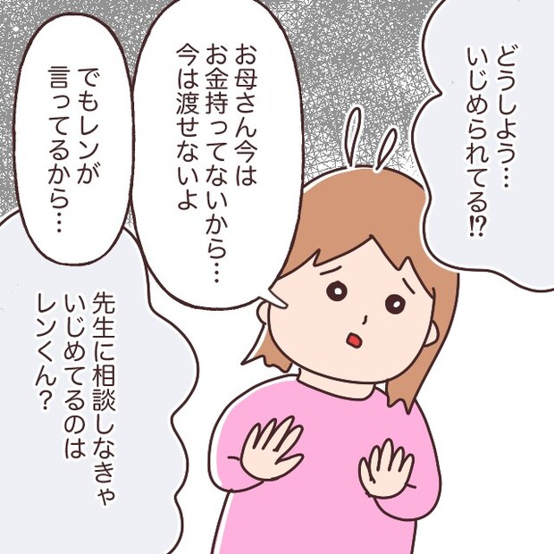 「どうしよう・・いじめられてる!?」と心がざわつくお母さんが、「お母さん今はお金持ってないから・・今は渡せないよ」と答えると、「でもレンが言ってるから・・」と言うシュン君の言葉を聞いて、「先生に相談しなきゃ。いじめてるのはレン君?」と心の中で呟きました。