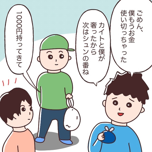 その後、「ごめん、僕もうお金使い切っちゃった。カイトと僕がおごったから次はシュンの番ね。1000円持ってきて」と3人で集まった時、レン君はシュン君に言いました。