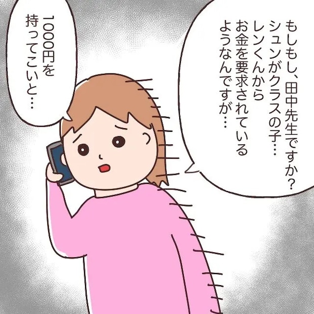 そして、「もしもし、田中先生ですか?シュンがクラスの子・・レンくんからお金を要求されているようなんですが・・1000円を持ってこいと・・」とすぐ学校に電話をしたのでした。