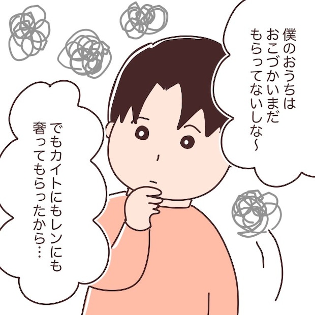 そう言われたシュン君は、「僕のおうちは、おこづかいまだもらってないしな~。でもカイトにもレンにもおごってもらったから・・」と考えた末に、