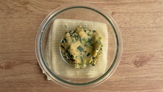 2. [B]を入れて、シリコンベラで切るように混ぜる。粉っぽさがなくなってきたら青ねぎを加えて合わせ、手で折り畳むように数回捏ねてまとめる。