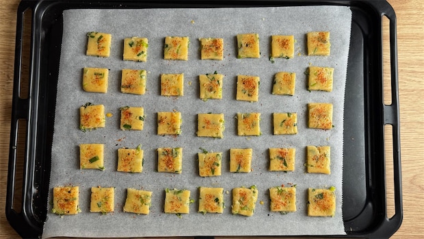 4. 残りの卵をクッキーの表面にサッとハケで塗り、七味を散らす。160℃のオーブンで23〜25分焼く。天板にのせたまま冷ます。