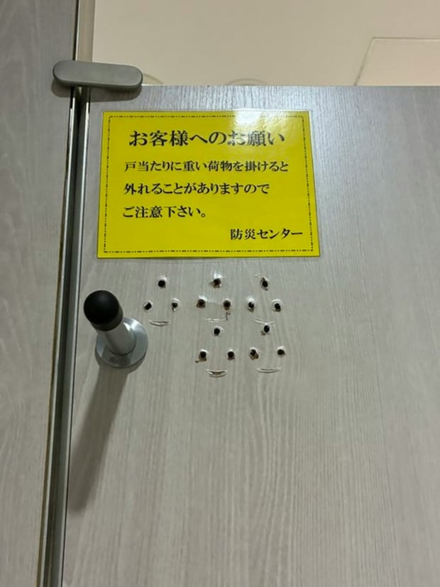 注意書きのすぐ下を見ると、無数のネジ穴が…。明らかに何度も付け替えられてきた戸当たりの歴史が刻まれていますね。そして今ついているのは、おそらく6代目の戸当たりです。これまでの先代たちが力尽きてきたであろう中、果たしてどこまで持ち堪えられるのでしょうか。