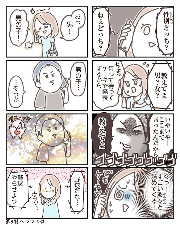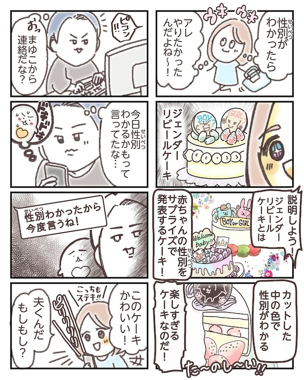 赤ちゃんの性別がわかると、対面が待ち遠しい気持ちが高まりますよね。コミカルな夫婦のやり取りにほっこりするエピソードでした。
