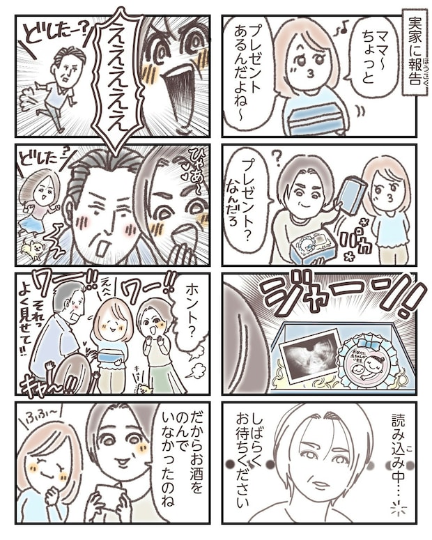 ご両親の嬉しそうな様子に、こちらまであたたかい気持ちになりますよね。「だからお酒を飲んでいなかったのね」というお母様のひと言も、思わずクスッとする場面でした。