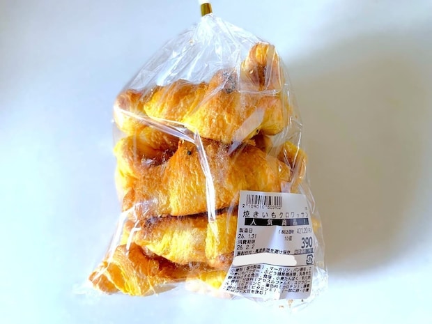 ロピアのベーカリーコーナーで「人気商品」の札が躍る、芋好き必食のクロワッサンです。