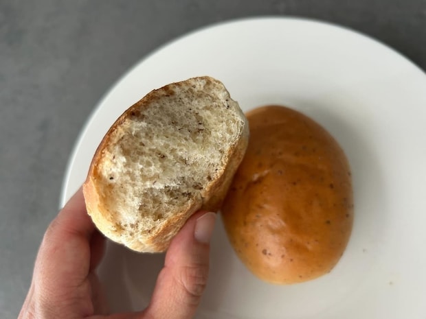通常のバターロールに比べて甘さは控えめで、素朴ながらも噛むほどに滋味深い味わいが広がります。