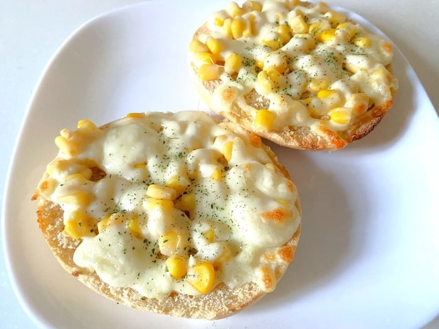 真ん中にコーンとチーズを乗せて焼くと、腹持ちもよく朝にピッタリ!