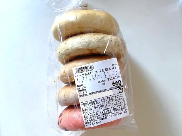 このベーグルMIXは、プレーン、ブルーベリー、メープル、ダージリン、いちごの5種類が詰め合わせ。