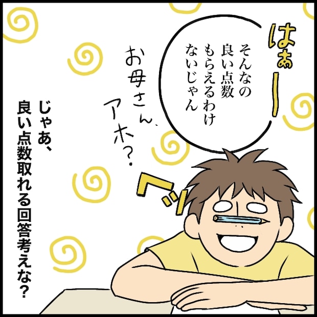 今度は「はぁー」と溜息をついて「そんなの良い点数もらえるわけないじゃん。お母さん、アホ?」と小ばかにしたように言ってきました。きぃぃー!!本当に・・ああ言えばこう言う・・。でも、私は「じゃあ、良い点数取れる回答考えな?」と喉元まで出かかった言葉を飲み込んで、息子が宿題を最後までやり遂げられるようにイライラを封じ込めて笑顔で聞き流します。たまにはすんなり宿題を終わらせてくれー!!と毎日祈っている母でした。