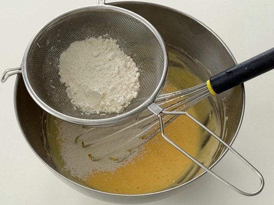 3. ボウルに1を入れて、卵黄、グラニュー糖の半量、レモン汁、塩を加えてよく混ぜます。牛乳、溶かしバターを順に加え、混ぜます。薄力粉をふるい入れてさらに混ぜます。