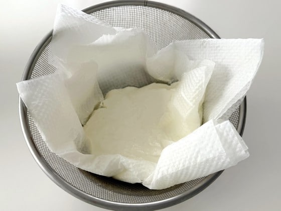 1. ボウルにザルを重ね、キッチンペーパーを3〜4枚のせてヨーグルトを入れて重量が約半量になるまで水切りします。