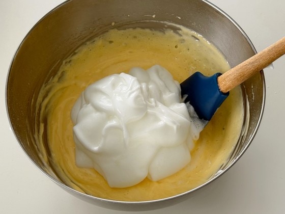 4. 別のボウルに卵白と残りのグラニュー糖を加え、ゆるく角が立つまで泡立てます。3に1/3量を加えて泡立て器で混ぜます。残りを加えてゴムベラで切るように混ぜ型に流し入れます。