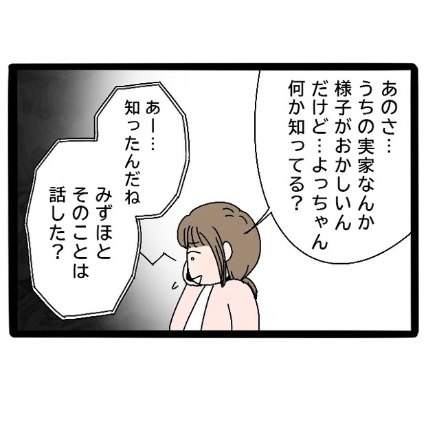 私は正直に「うちの実家、なんか様子がおかしいんだけど、よっちゃん何か知ってる?」と聞きました。すると「あー・・・」と少し言いにくそうな感じのよっちゃんは、「知ったんだね。みずほとそのことは話した?」と言いました。やっぱり何か知っているようです。私は早く詳しく聞きたい気持ちと聞くのが怖い気持ちとで複雑でした。