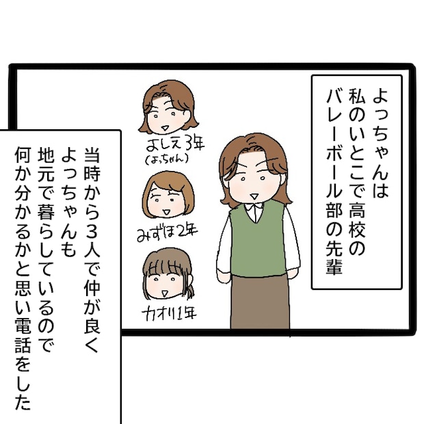 私の従姉であるよっちゃんもまた、みずほ先輩と3人で仲が良かった高校バレーボール部の先輩でもあります。卒業後もずっと地元で暮らしているよっちゃんなら、何か実家のことがわかるか聞いてみようと思ったのです。