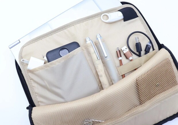 ファスナー付きメッシュポケット・仕分けポケット・ペンホルダー・ゴムバンド・PCスリーブ…と収納力がとにかくすごい!