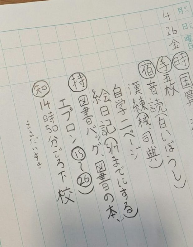 長女9才の連絡帳。