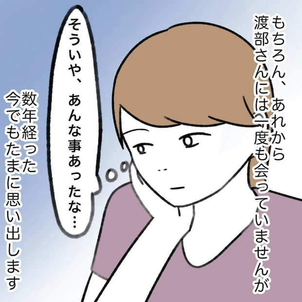 それから、渡部さんの自称おさがりによる嫌がらせはなくなりました。そしてある日、お迎えで歩いていた渡部さんをかかじりさんは呼び止めたのでした。