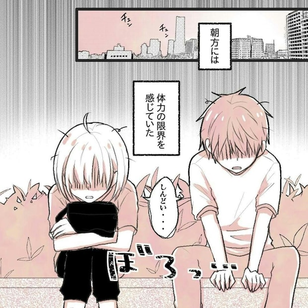 りんさんとゆーさんのバッティング勝負は、ゆーさんの勝利に。このあとも時間を忘れて遊び続けた2人は、朝日が昇るころには体力も限界に…。
