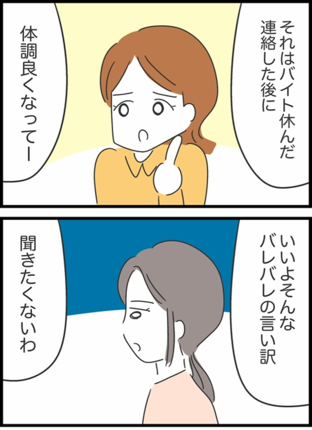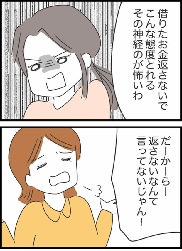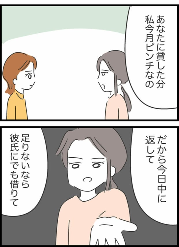 Aちゃんから嘘だとわかっていると言われたCちゃん。しかし、嘘とは認めず「バイトを休んだ後に体調が良くなった」と言います。まったく悪びれる様子もなく「いつものAと違って怖い」とまで言い出すCちゃん。その態度にAちゃんはついにブチギレしてしまいます。彼氏に借りてでも今日中にお金を返してと強い姿勢でCちゃんに話をしたのでした。