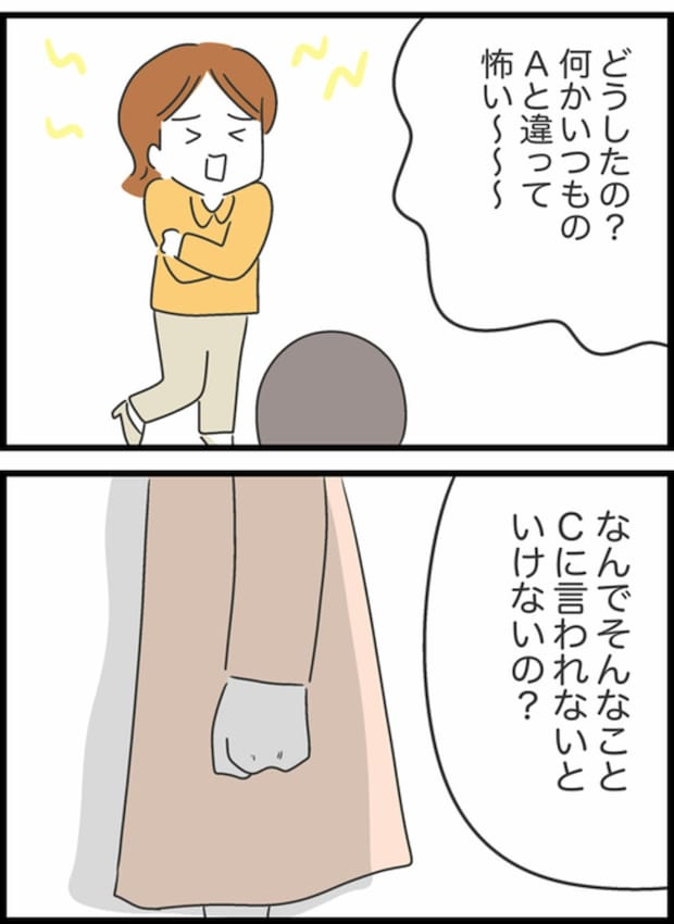嘘だと知っていると言うAちゃんにCちゃんは嘘ではないと主張しますが、あまりにもバレバレな言い訳にAちゃんは「聞きたくない」と言います。普段と違うAちゃんの様子にふざけた様子で「怖い」というCちゃん。冗談や笑いを入れればどうにか乗りきれると思ったのかもしれませんが、そんなCちゃんの態度がAちゃんを怒らせてしまいます。