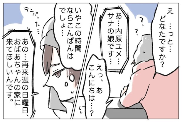 サナの娘と聞いて動揺した私は、思わず「こんにちは」と間の抜けた返事をします。いや、この時間なら「こんばんは」でしょ・・・自分、動揺しすぎ。するとユメちゃんが「あの再来週の日曜日、おばあちゃんの家に来てほしいんです」と話を切り出しました。