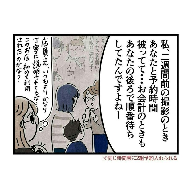ある日、3人の子どもの七五三写真を撮影してほしいと来店した橘さんは、撮影時には文句を言わないのに最後の商品選びになると細かい部分が「気になる」と言って指摘が増えるお客さんでした。目のハイライトの位置が気に入らない、ズームして分かる程度のアホ毛が気に入らない…などクレームを重ね、ついに4度目の再撮影に突入。
