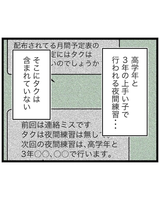 夜間練習に自分の息子だけ呼ばれなかった理由を確かめようと、トークルームで確認したもっつんさん。しかしそこでわかったのは、高学年の練習に息子は含まれていないという事実だけでした。備品もそろえ、学年区分にも当てはまるのに…。やるせない思いがもっつさんの胸に押し寄せます。