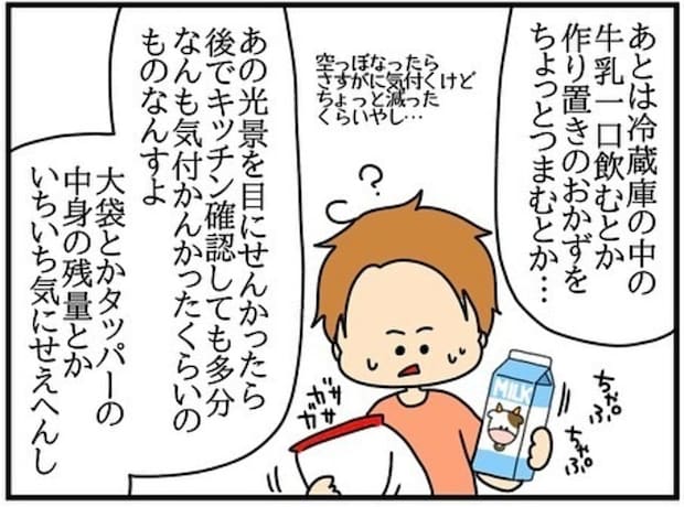 大谷さんが見たのは、チコちゃんがキッチンの戸棚や冷蔵庫から食べ物をポケットや口に詰め込む姿でした。手を付けたのは、安いお菓子や牛乳一口、作り置きのおかずのほんの一部だけ。その話を聞いた夫はひたすら謝るしかありませんでした。