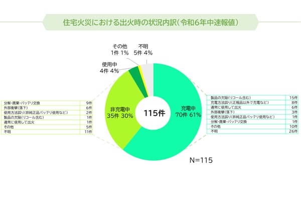 東京消防庁が2025年に発表した製品用途別の火災状況によると、モバイルバッテリーから出火した火災が最多で35件。次に電気カミソリ、携帯電話となっていて、ポータブル電源による火災発生件数は8件でした。また、リチウムイオン電池関連火災(2024年)のうち、約6割が充電中に発生していたこともわかっています。