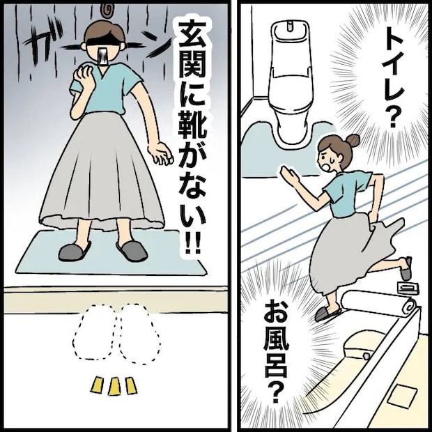 私は慌てて、家中を探し回りました。トイレやお風呂、リビングに納戸まで、思いつく場所を片っ端から確認します。けれど、どこにも息子の姿は見当たりません。嫌な予感がして玄関へ向かうと、なんと玄関にあるはずの息子の靴がありません。