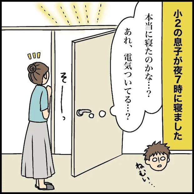 そんなある晩、小学2年生の息子が「疲れたからもう寝る」と言って、珍しく夜7時に布団へ入りました。1時間ほど経ち、本当に寝たのか気になって部屋をのぞいてみると、寝ているはずなのになぜか電気がつけっぱなしになっていました。