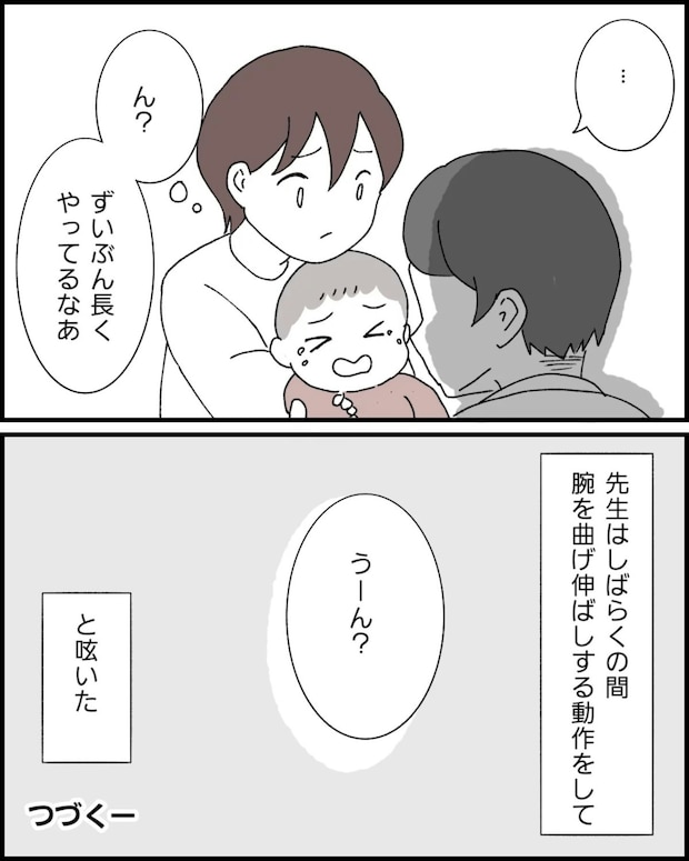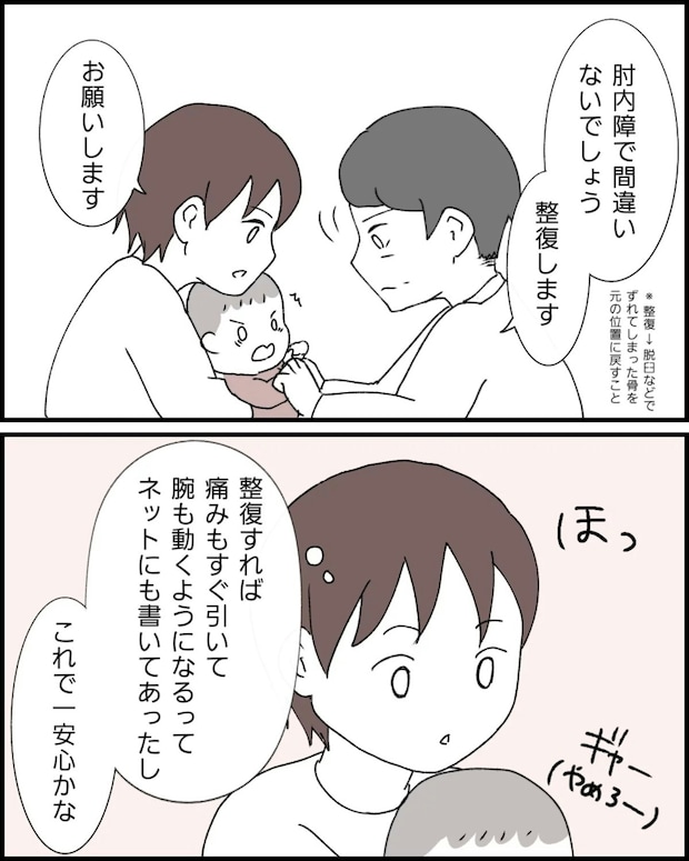 娘の動かなくなった右腕を診てもらうため、整形外科へ来たなっぽさん。「肘内障」と診断され、医師に右腕の外れた関節を戻してもらって一安心。これで治ったとホッとしていたのですが、医師のようすが何かおかしいと気づきます。