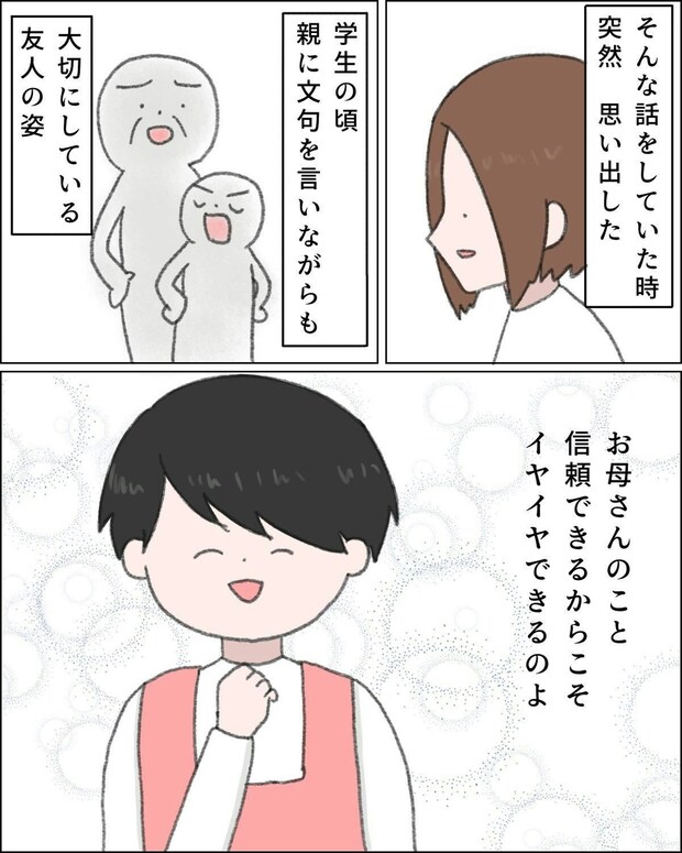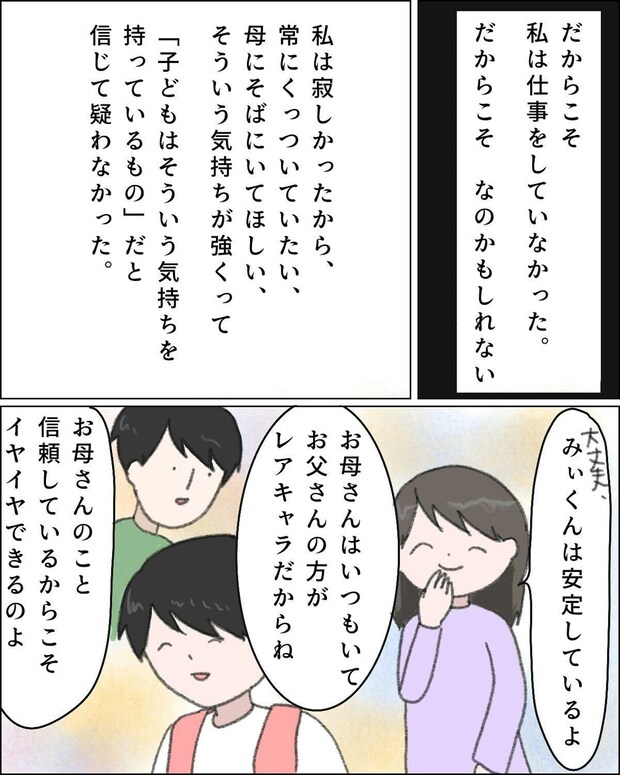 自分でも「今は不安定な時期だから」と分かっていても、ネガティブな感情の連鎖から抜け出すのは簡単ではありません。そんな中で、自身の子ども時代の経験が影響していることに気づきます。しかし、みぃくんは自分の子どもであっても別の人格をもつ存在。自分が満たされなかった思いを重ねるのではなく、ありのままの子どもを見つめ、感じ方や選択の違いを受け止めることの大切さに気づいていきました。