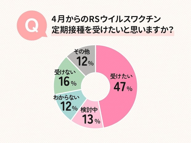これまでは3万円程度の自己負担が発生したRSウイルスワクチン接種。定期接種化で費用の壁がなくなり、赤ちゃんのために接種したいと考える人も多いようです。妊婦さんの回答もポジティブな結果に。「受けたい」「検討中」を合わせると、接種に前向きな妊婦さんは60%。また「その他」には、すでに自費で接種済みと答えた人も含まれていました。