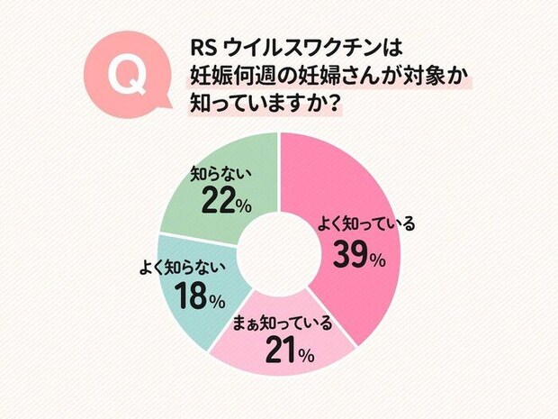 低月齢の赤ちゃんが重症化しないため、定期接種の対象となるのは、妊娠28〜36週6日まで。この接種時期の認知度についても、「知らない」と答えた人は22%。