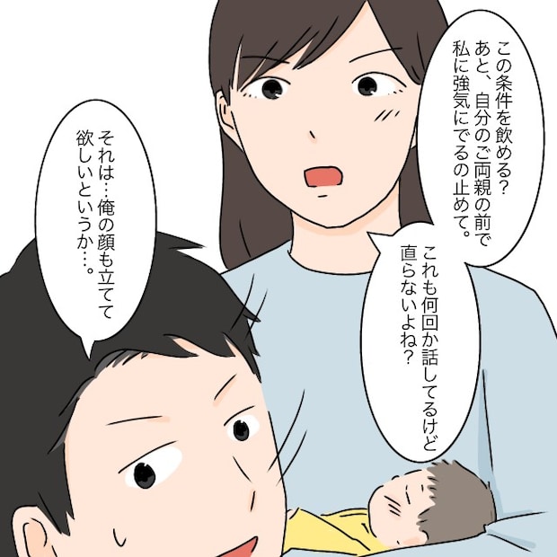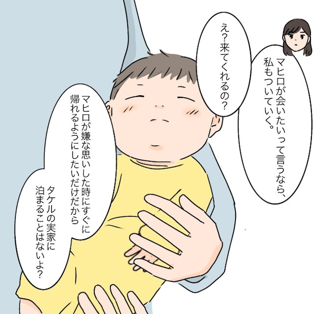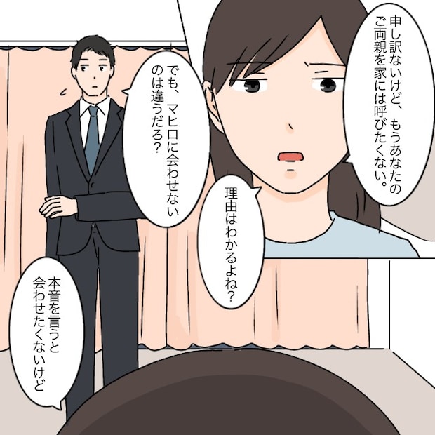 私は「申し訳ないけど、もうあなたのご両親を家には呼びたくない」とはっきり伝え、「理由はわかるよね?」とタケルに迫りました。タケルも思い当たるところはあるようでしたが「でも、マヒロに会わせないのは違うだろ?」と言うので、「本音を言うと会わせたくないけど・・」