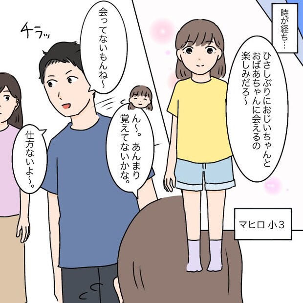 時が経ち、マヒロは小学3年生になりました。今日はタケルの実家に行く日です。タケルが「ひさしぶりにおじいちゃんとおばあちゃんに会えるの楽しみだろ~」と言うと、マヒロが「ん~。あんまり覚えてないかな」と答えました。すると、タケルは私をチラッと見ながら「会ってないもんね~。仕方ないよ~」と含みを持った言い方。こういうところ、本当に義両親にそっくりです。私はイラっとしながらもタケルの嫌味をスルーしました。
