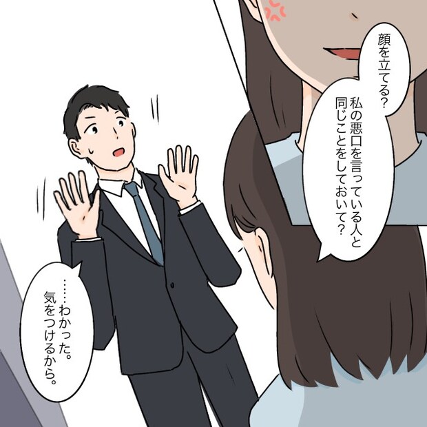 私はタケルの身勝手な主張にキレそうになるのを必死に堪え「顔を立てる?私の悪口を言っている人と同じことをしておいて?」と詰め寄ると、タケルは「・・わかった。気をつけるから」と渋々納得しました。。