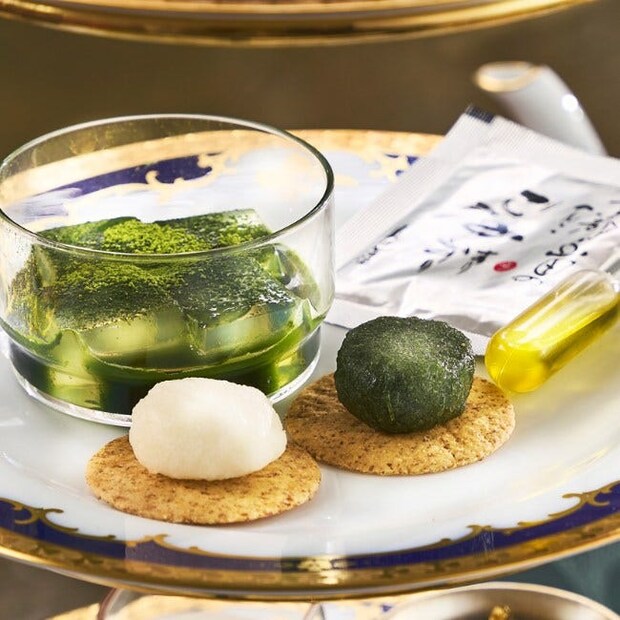 瓢箪型の「干菓子」は、錦玉 キャラメルと寒氷 柚子の2種類がラインナップ。ホテル内にある数寄屋風別館「佳水園」の白砂の中庭を彩り、同園のロゴにも刻まれた瓢箪の意匠をひと口に込めている。
