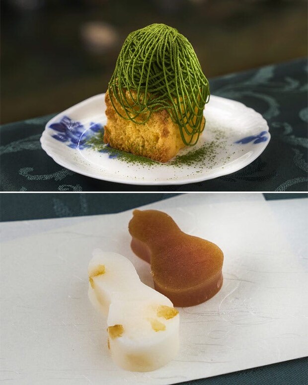 たねやカステラを活かした抹茶モンブランと2種類の干菓子は別皿で