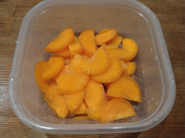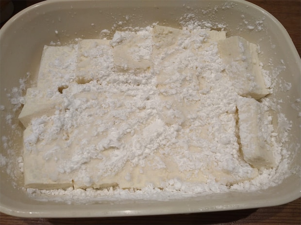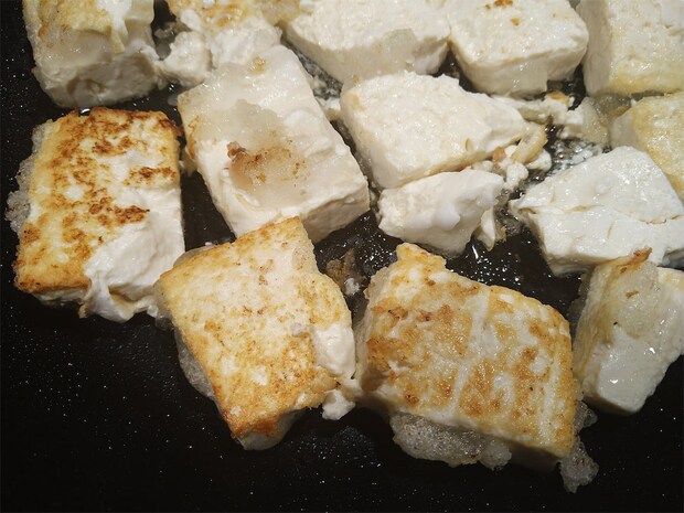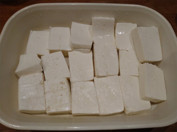 1. 木綿豆腐をキッチンペーパーで包んで耐熱皿にのせ、600Wの電子レンジで3分程加熱する。粗熱が取れたら、豆腐を食べやすい大きさに切る。