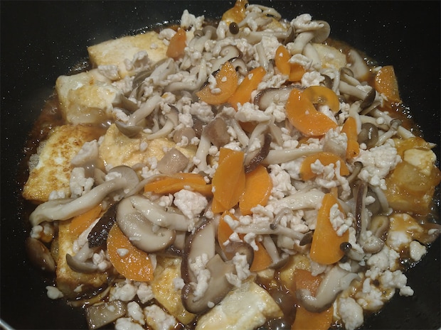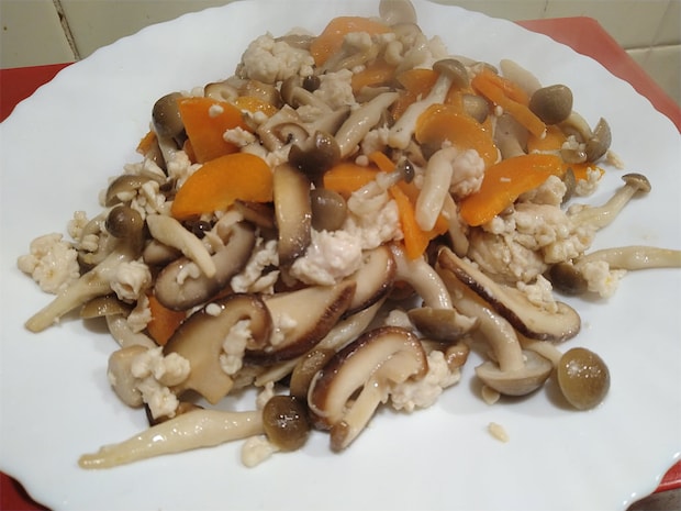 5. フライパンにサラダ油を引いて熱したら、ひき肉、にんじん、しいたけ、しめじを火が通るまで炒める。